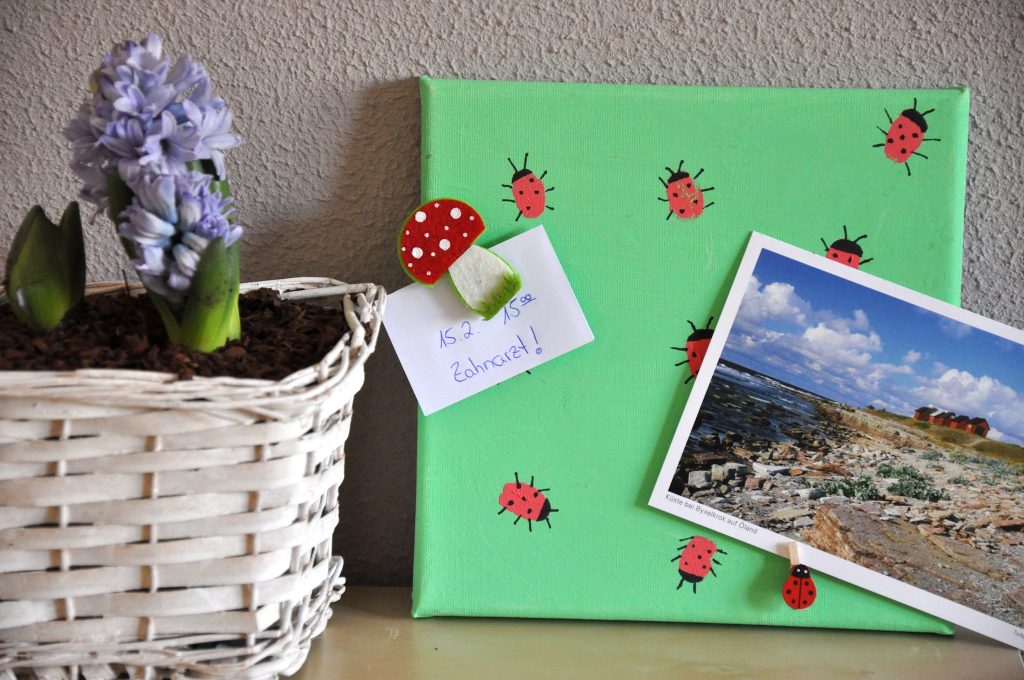 Da es dem großen Sohn so viel Spaß gemacht hat und er generell sehr gerne bastelt, hat er sogar noch ein zweites Board gebastelt. Dazu hat er den Untergrund der Leinwand grün angemalt und mit Fingerabdrücken kleine Marienkäfer auf die Wiese gedrückt. Beim Bemalen der kleinen Marienkäfer war ich ihm dann behilflich. Ich finde die Ergebnisse aller drei Memoboards wirklich klasse.