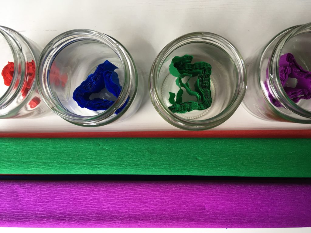 Bevor es los geht schneidest du das Krepppapier in Streifen und legst diese in die Gläser.