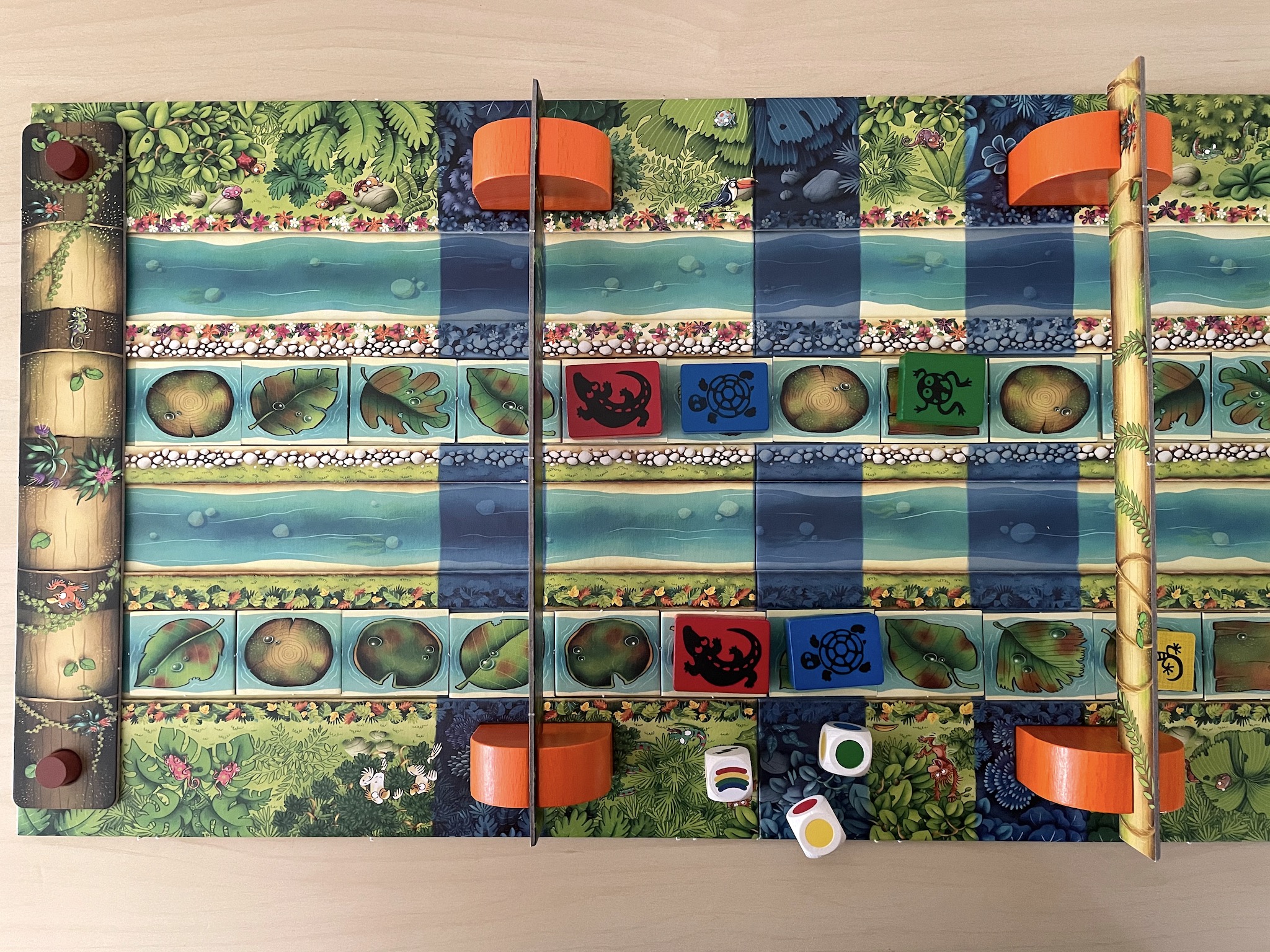 Dieses lustige und farbenfrohe Gemeinschaftsspiel bereitet der ganzen Familie großen Spielspaß. Denn das Ziel des Wettlaufspieles ist es, all seine Tiere über den Fluss und auf den rettenden Baumstamm zu bringen. Dabei sind jedoch die unterschiedlichen Höhen der Parcours zu beachten. Zu hoch gestapelte Tiere passen nicht unter den beiden Brücken hindurch und müssen leider zurück bleiben. Derjenige, der als erster und schnellster seine Tiere in Sicherheit gebracht hat, gewinnt.