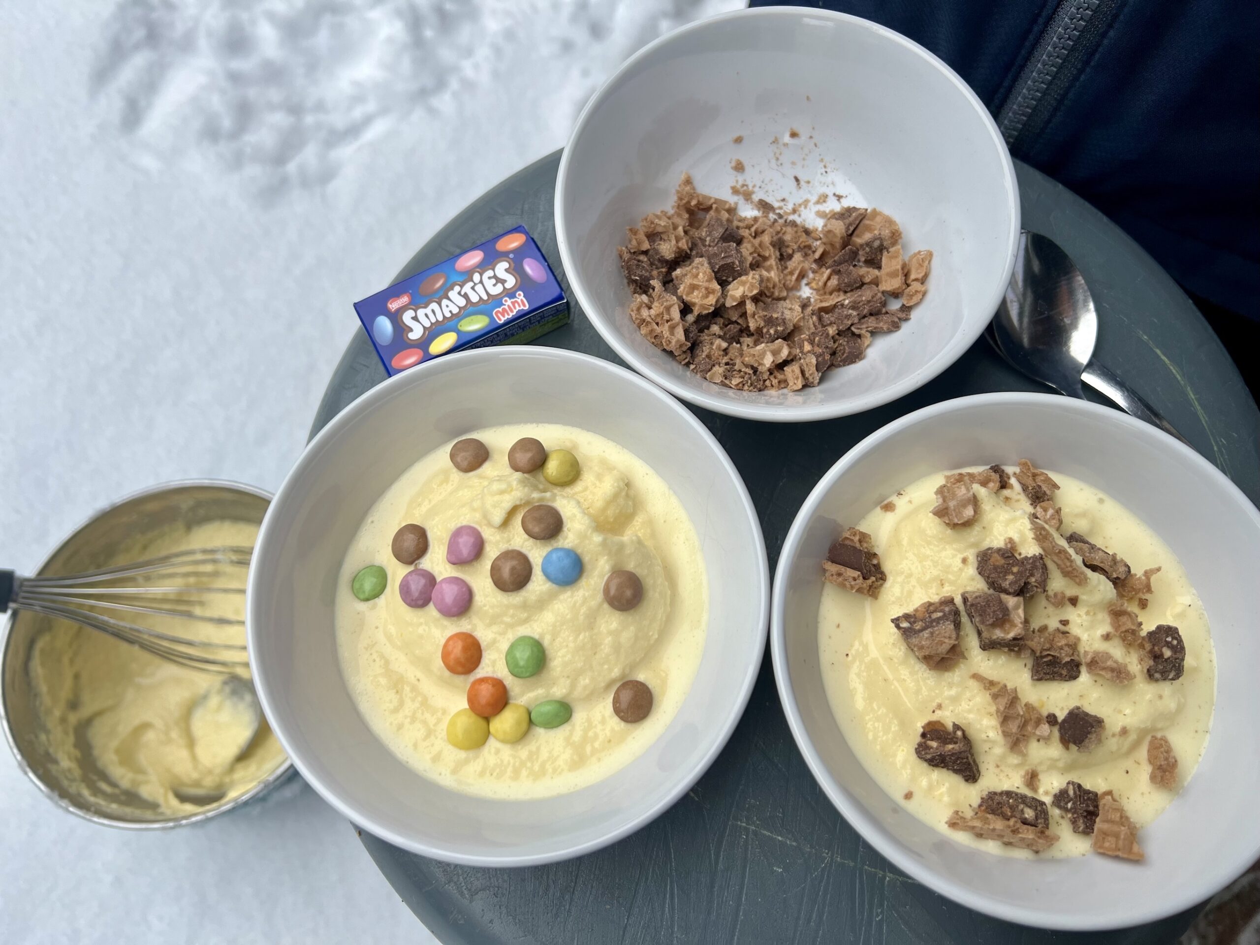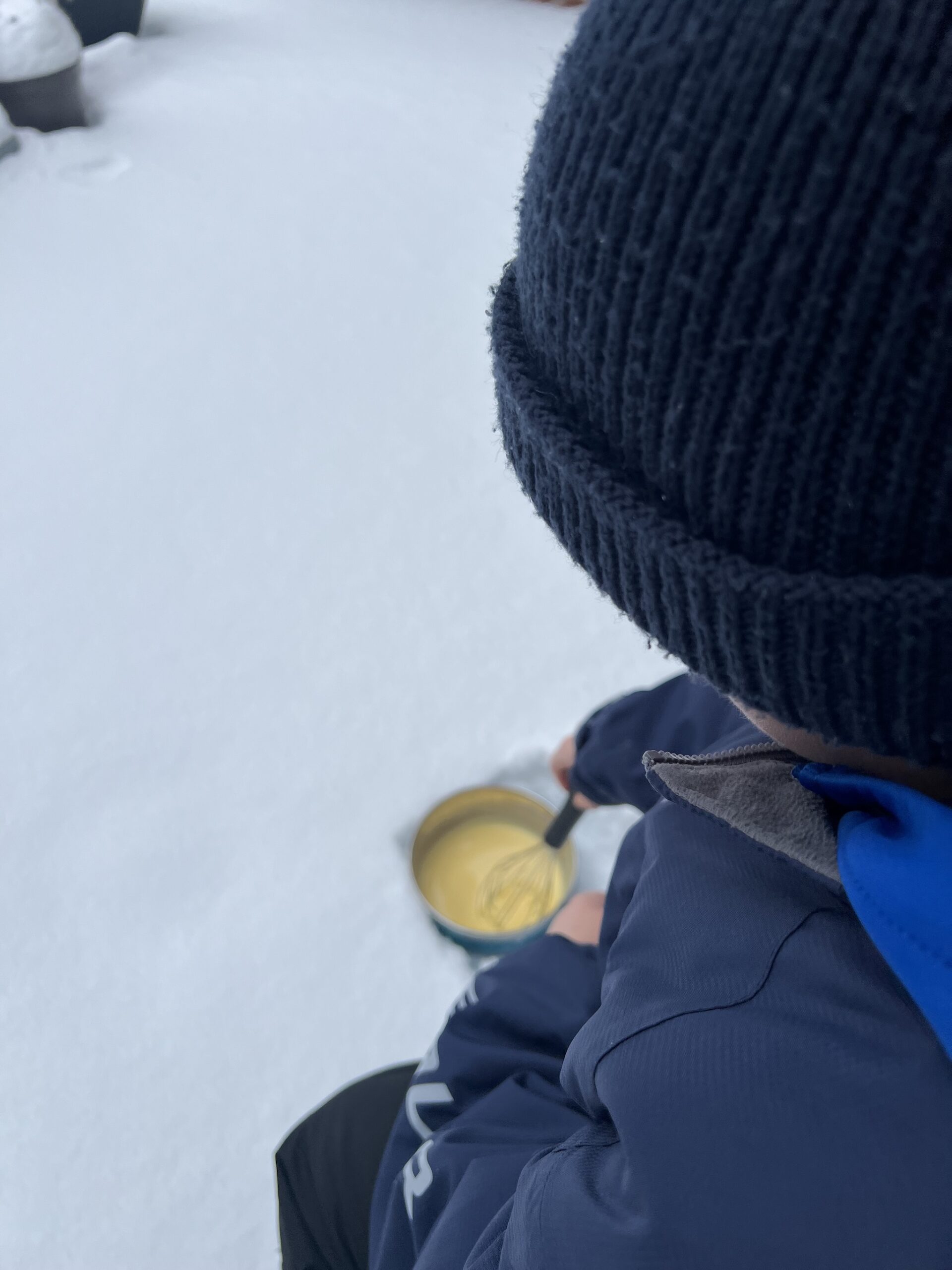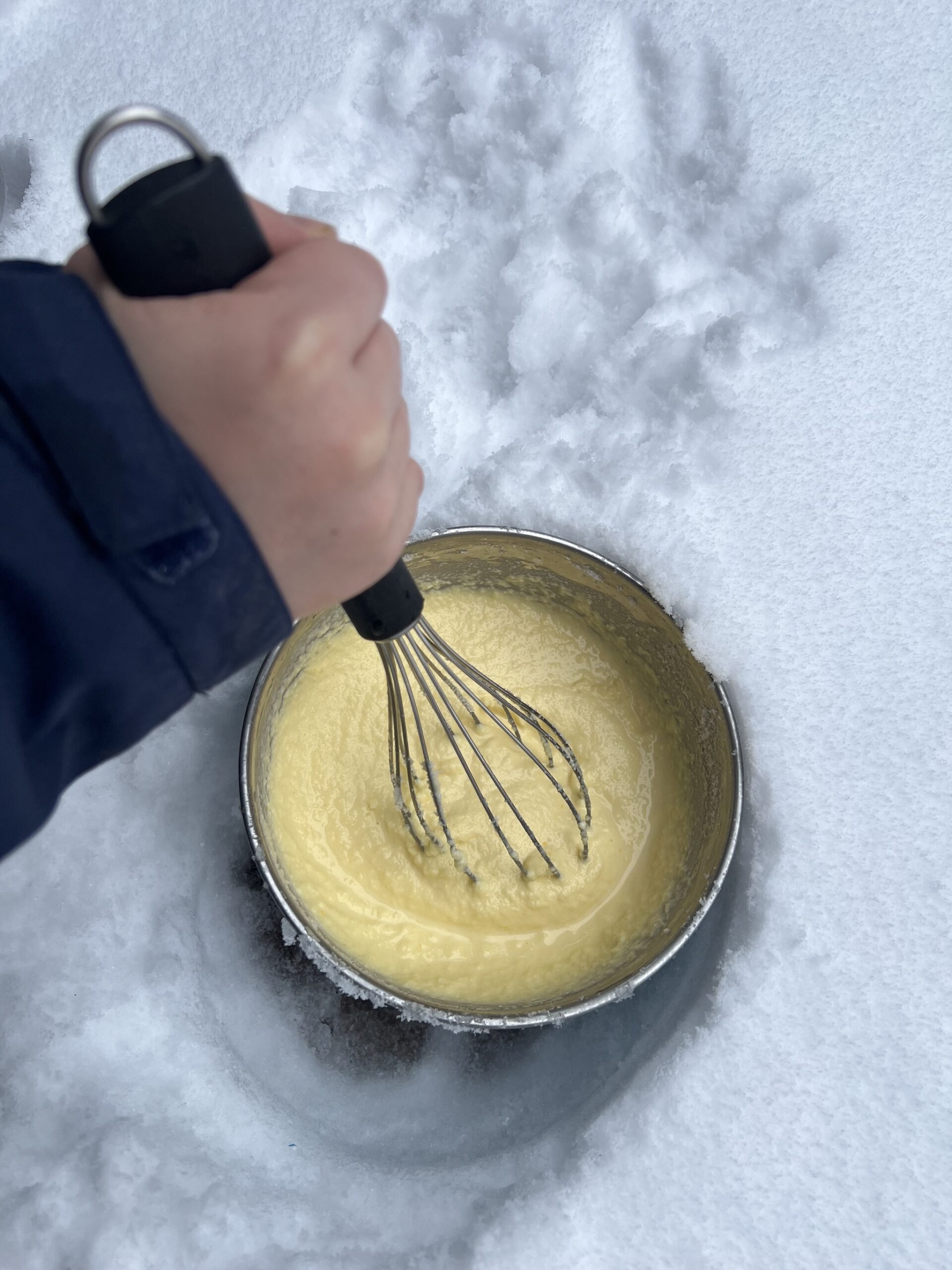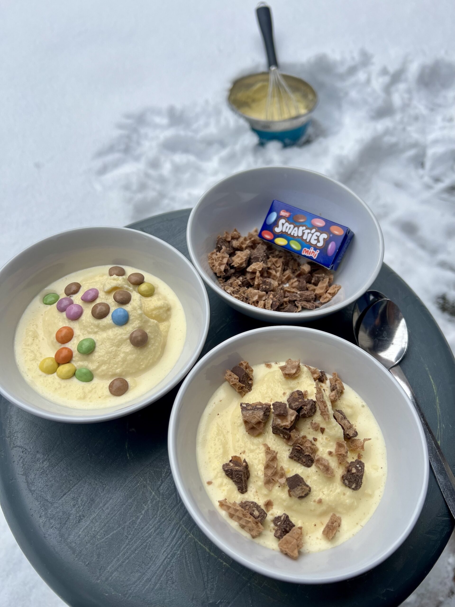 So wird’s gemacht: Suche dir eine feste Schneemulde und streue etwas Salz hinein. Stelle nun die Schüssel in die Mulde und gib die Sahne, das Eigelb, den Puderzucker sowie den Vanillezucker hinein. Nun musst du oder ihr, ich habe das Kind starten lassen, beginnen kräftig zu rühren. Bei uns hat das Ganze in etwa 15 Minuten gedauert bis eine cremige Konsistenz entstanden ist. Eventuell haben wir sogar ein bisschen Schnee hinzugegeben, damit es ein bisschen schneller geht. 😉