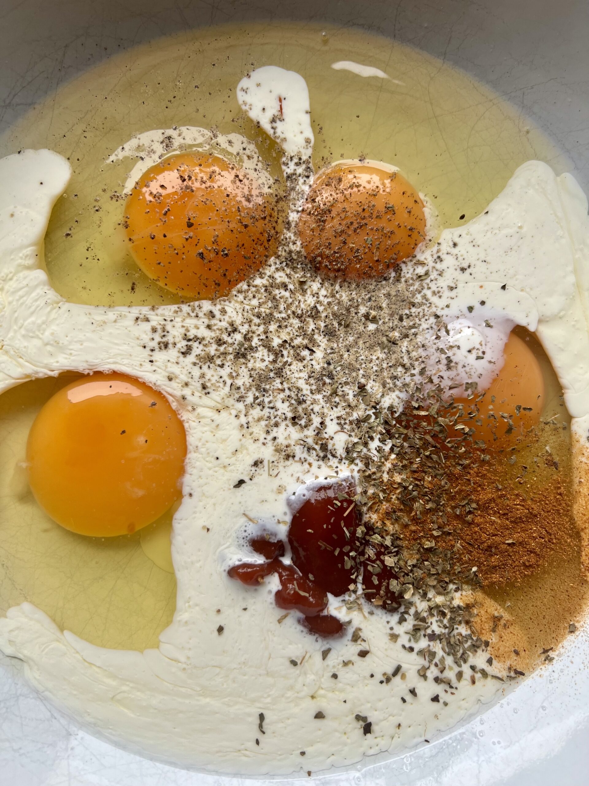 Gib die Eier, den Ketchup, die Sahne sowie 1 Teelöffel Salz, 1 Prise Pfeffer, das Basilikum und das Paprika in eine kleine Schüssel und verquirl alle Zutaten gründlich miteinander.