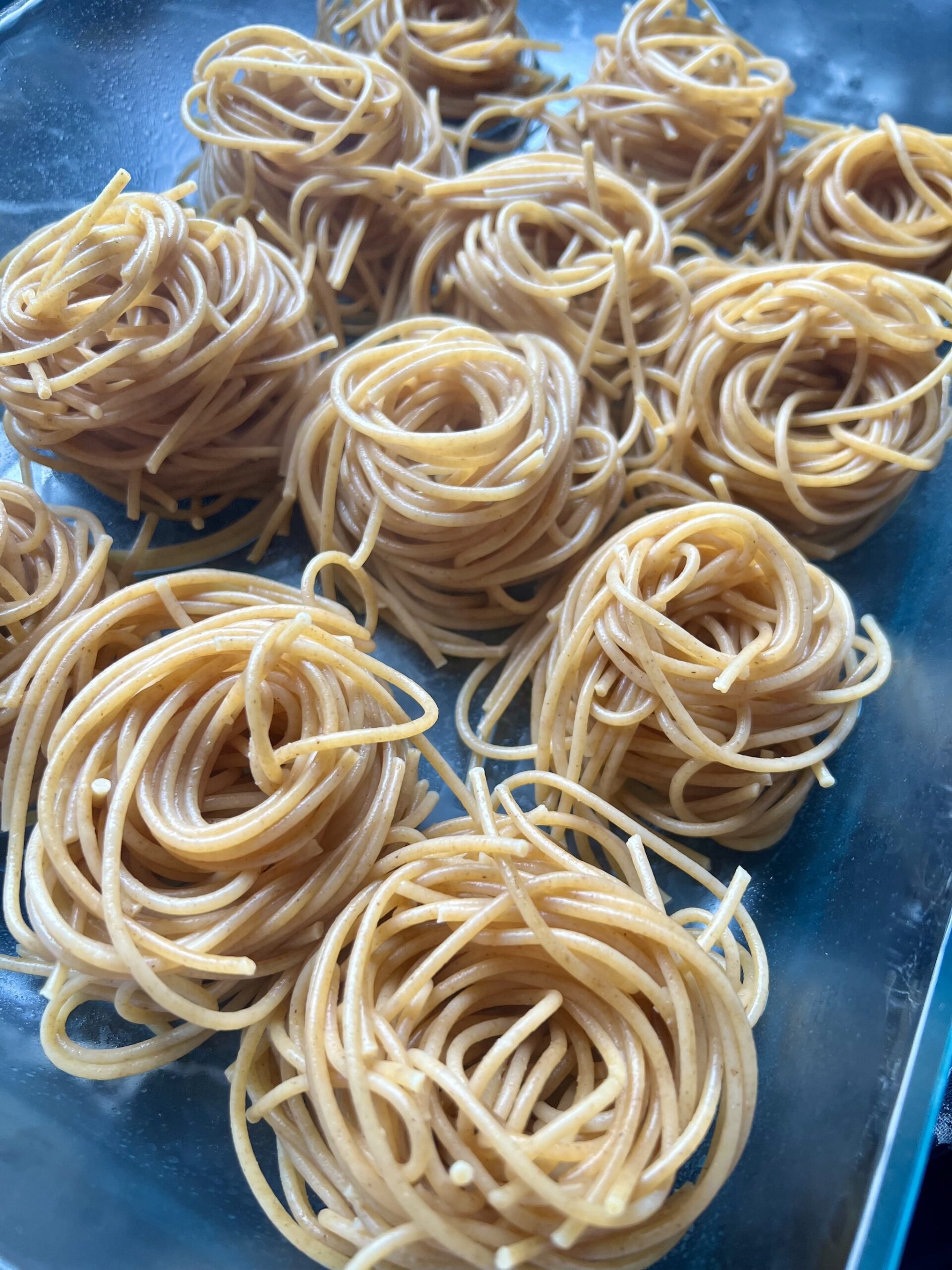 Fette eine Auflaufform mit Öl oder Butter ein. Dieser Schritt ist besonders wichtig, da die Sahne-Ei Mischung sonst an der Form haften bleibt. Drehe die Spaghetti nun mit Hilfe einer Gabel und einem Löffel zu kleinen Nudelnestern. Nimm anfangs nicht zu viele Spaghetti und probier dich hier erst mal ein bisschen aus. Nach ein paar Nestern hast du den Dreh schnell raus. 😉