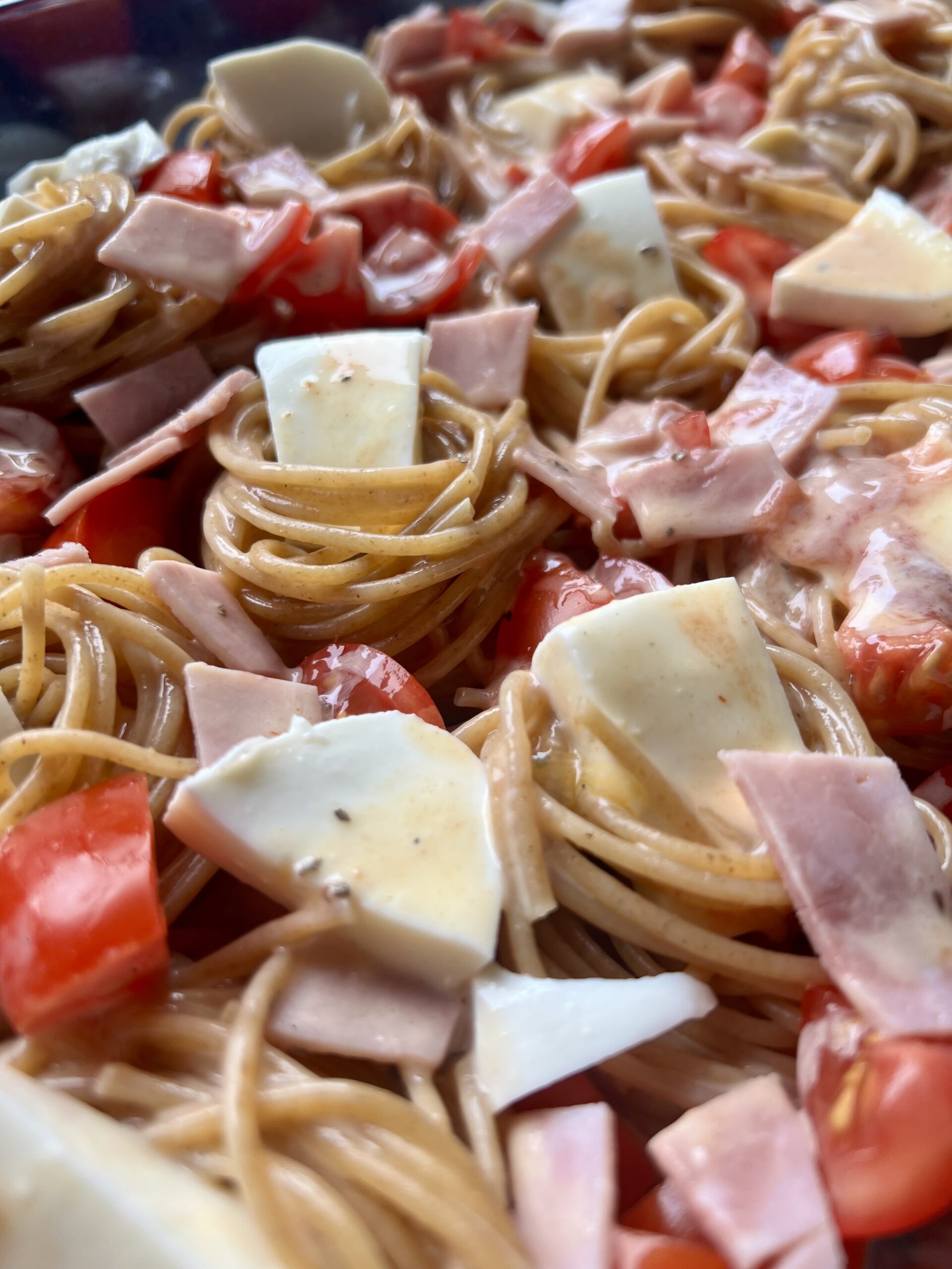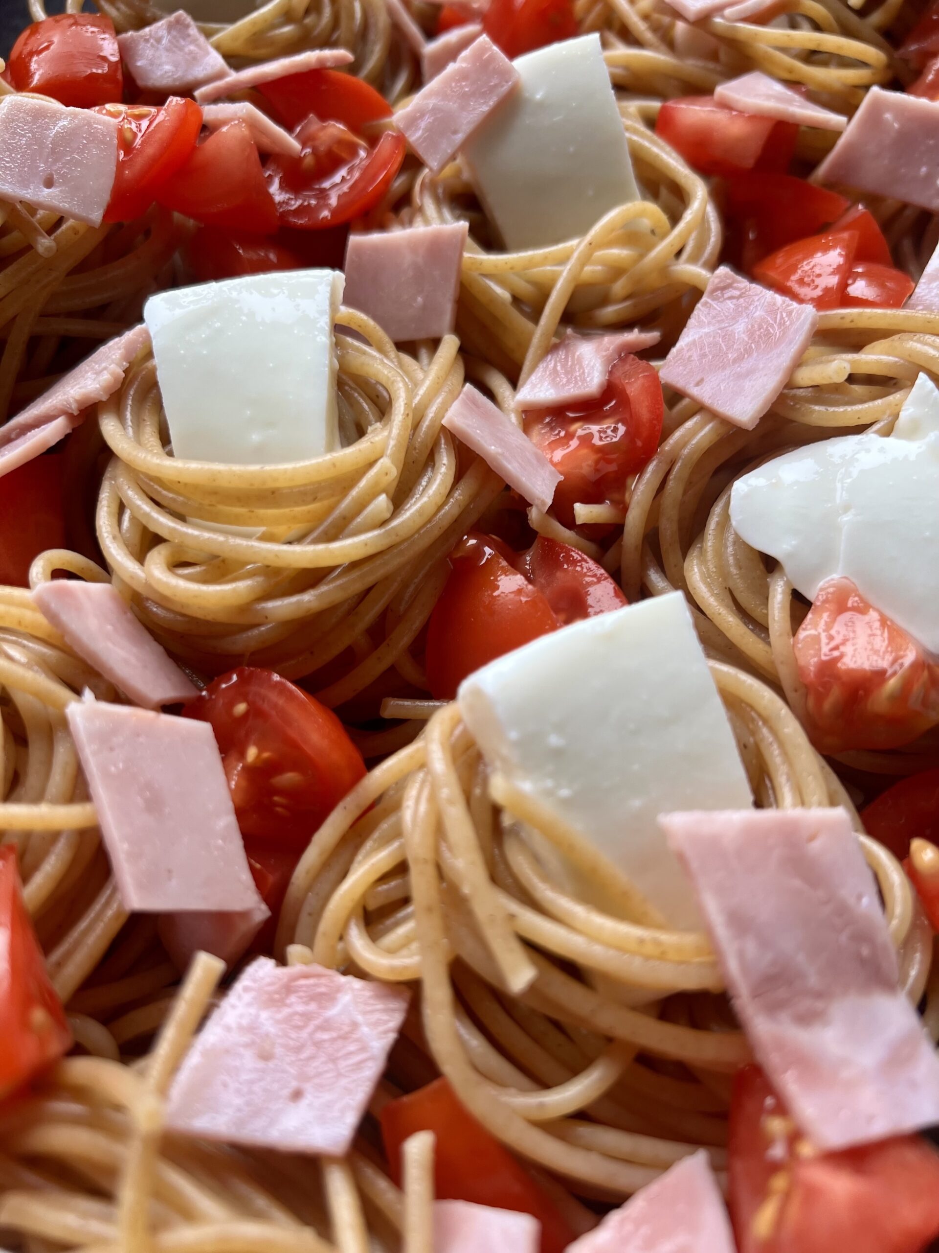 Verteile dann die Tomaten- und Schinkenwürfel über die Nudelnester und setze in jedes Nest eine Mozzarellakugel oder alternativ wie ich Mozzarellastückchen. Zum Schluss gießt du die Sahne-Ei-Mischung drüber.