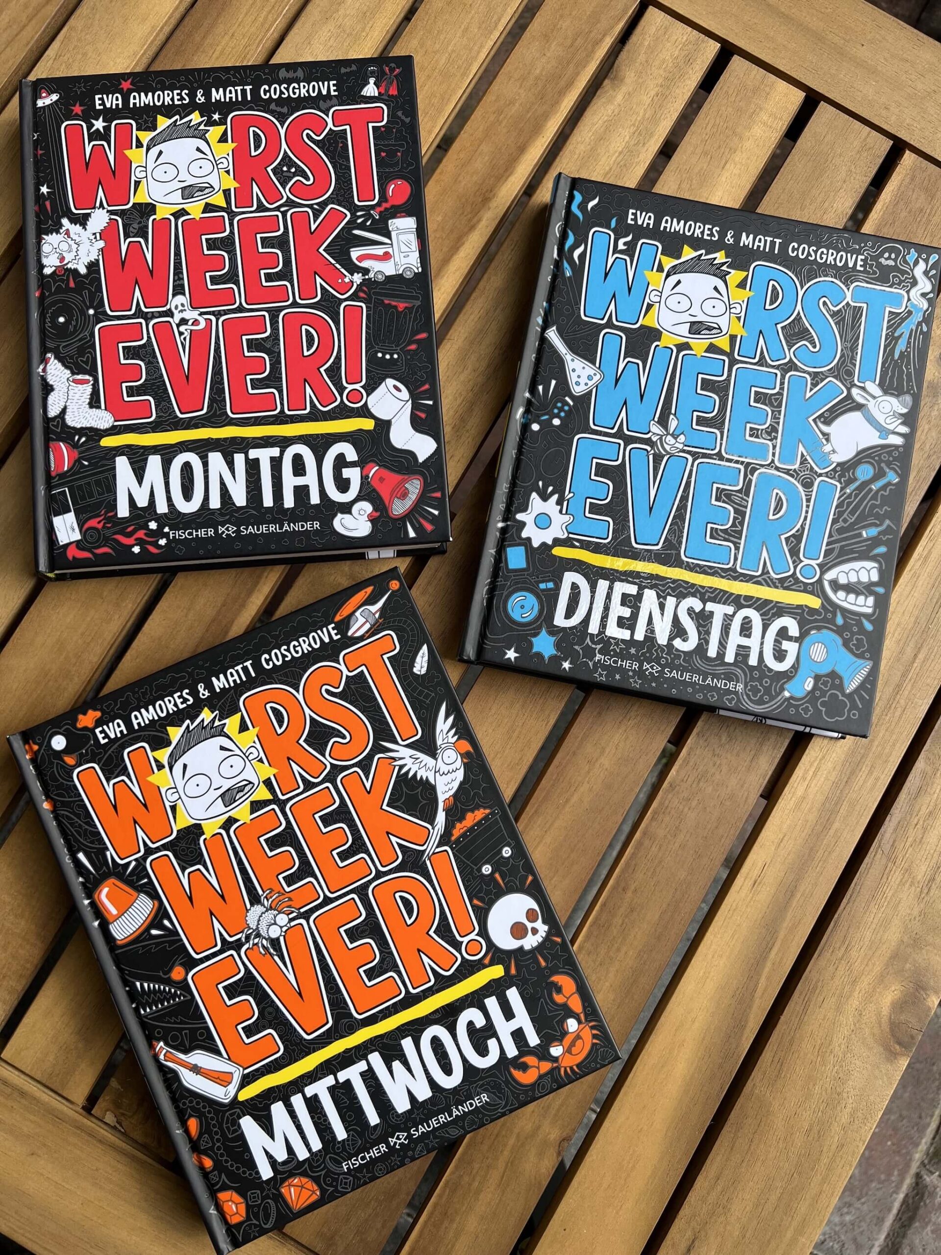 Zu diesem besonderen Anlass möchte ich dir neuen Lesestoff für deinen Teenie zu Hause liefern. Aber Achtung, Suchtgefahr! Denn wer mit dem ersten Band der insgesamt siebenteiligen Reihe anfängt, kann das Buch nicht mehr aus den Händen legen. Ich spreche von der Buchreihe Worst Week Ever – die schlimmste Woche meines Lebens. 7 Bände für 7 Wochentage. Geeignet für Kinder ab 10 Jahren.